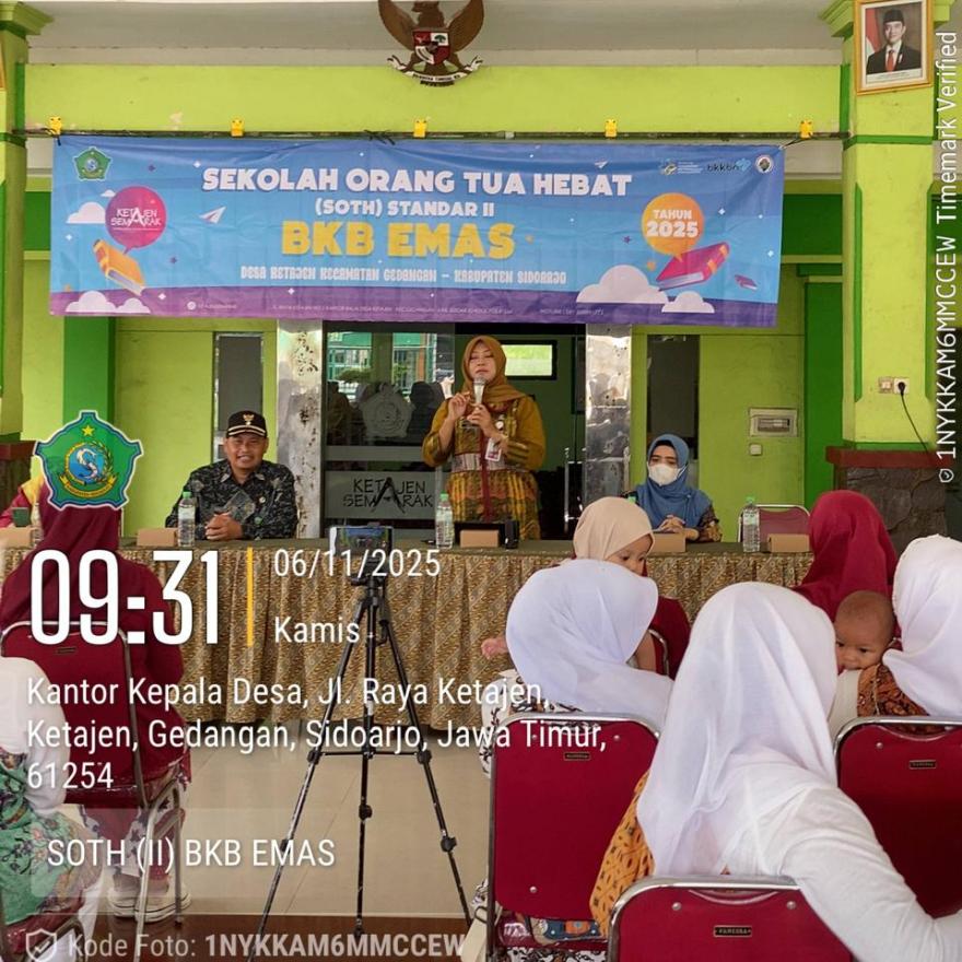 Kegiatan penutupan Sekolah Orang Tua Hebat (SOTH) Standar II BKB Emas Desa Ketajen dilaksanakan pada 6 November 2025 di Pendopo Kantor Desa Ketajen dengan melibatkan ibu balita, kader, Camat Gedangan, PLKB Kecamatan, Kepala Desa serta Ketua TP PKK Desa. Kegiatan ini menjadi penutup rangkaian program SOTH yang telah berlangsung selama enam kali pertemuan. Penutupan berlangsung meriah dengan berbagai rangkaian acara yang mencerminkan keberhasilan program. Selain sebagai ajang evaluasi, kegiatan ini juga menjadi bentuk apresiasi kepada seluruh peserta.